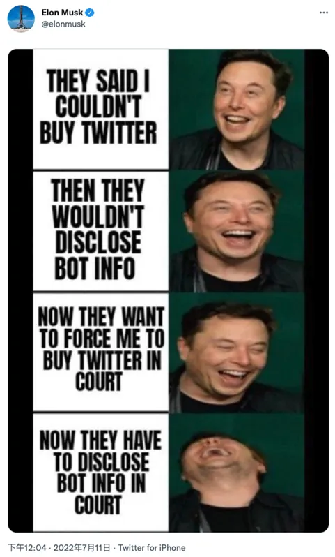 对此,马斯克在周日深夜发了一个诙谐的表情包进行了回应,并配上文字,“ 他们( 先是 )说,我不能收购推特。接着,他们又不披露虚假账户信息。现在,他们想在法庭上强迫我收购推特。现在,他们不得不在法庭上披露虚假账户信息。”