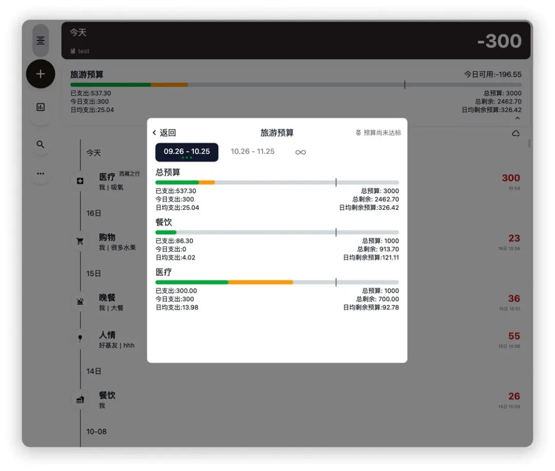 Cent 还支持了预算功能,支持任意分类的预算,支持指定标签和排除标签,并且实时展示当前预算的达成情况,并通过简单直观的视图呈现出来,实时了解自己的支出情况,有效减少超预算情况。