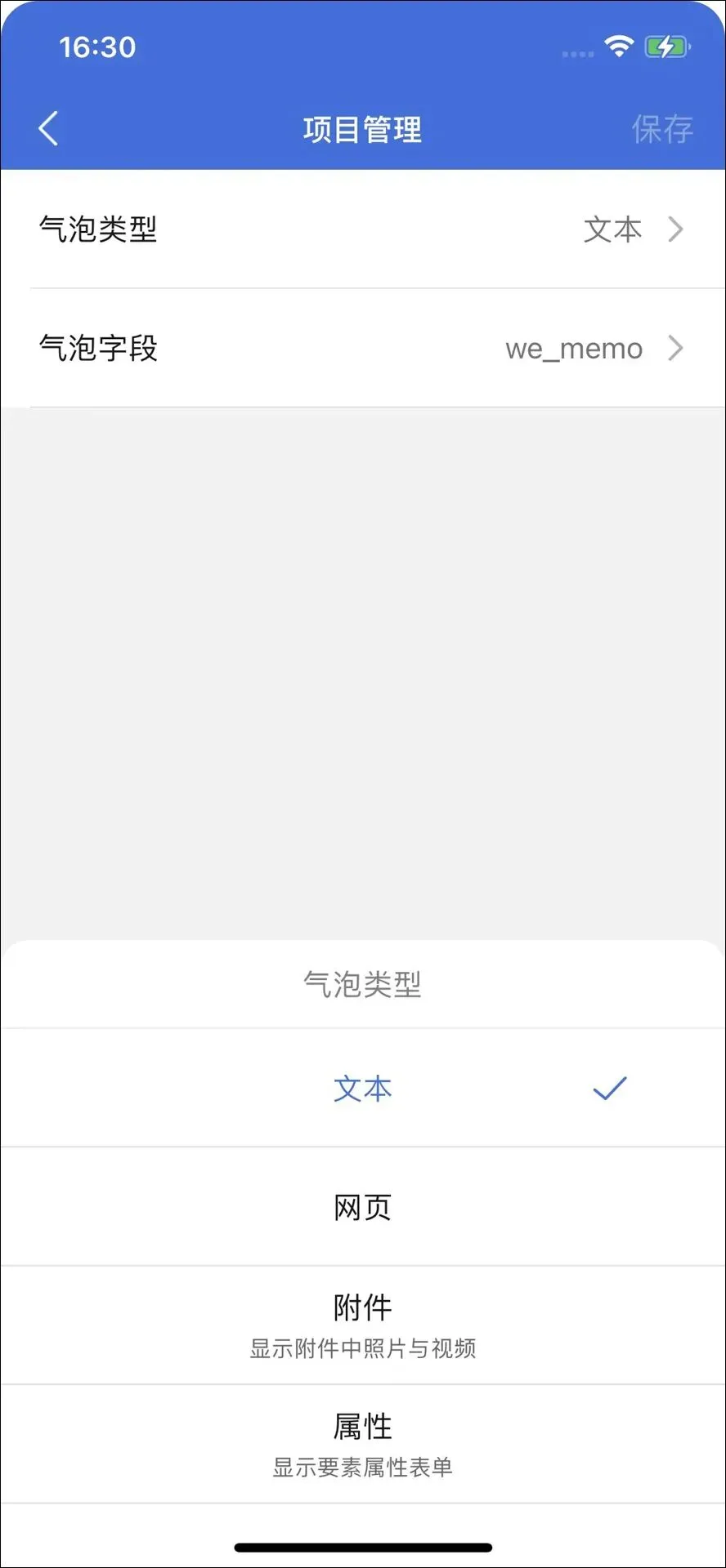 ① 气泡类型:下拉选项,可选项【文本、网页、附件、属性】