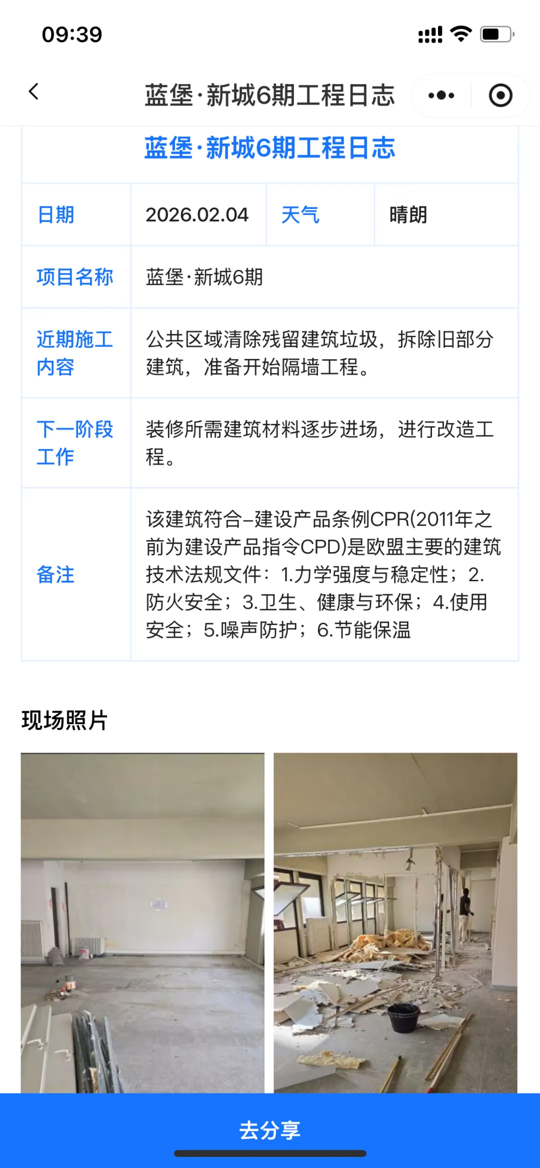 每一个项目都配有施工进度模块,从:打地基、主体施工、封顶、硬装、软装、交付准备,全部按阶段上传照片与更新记录。