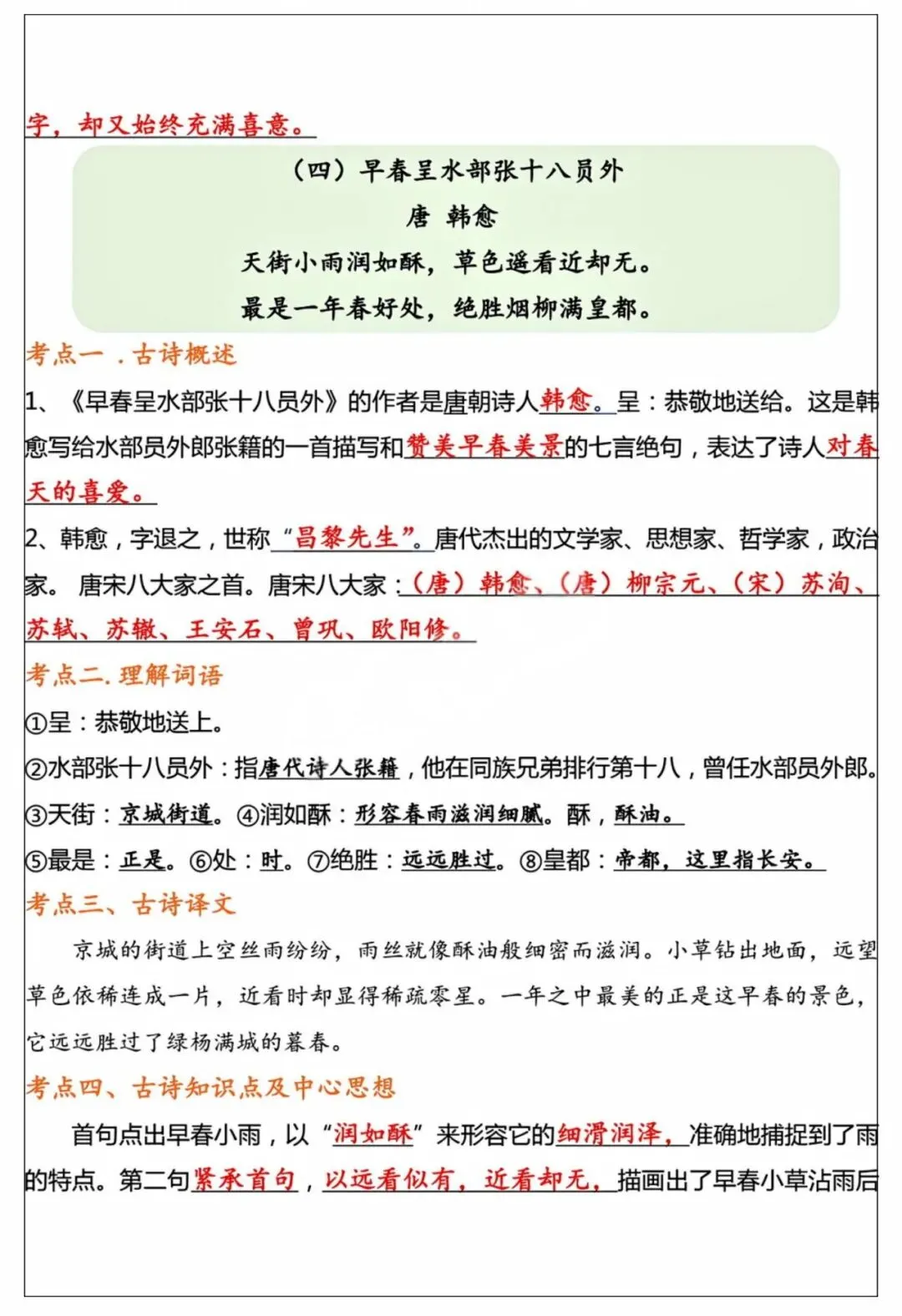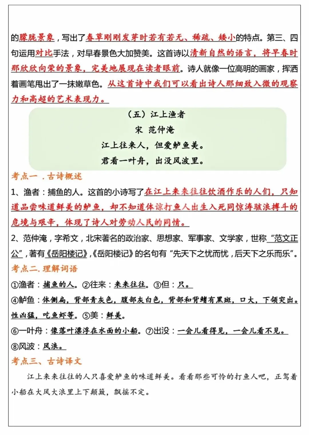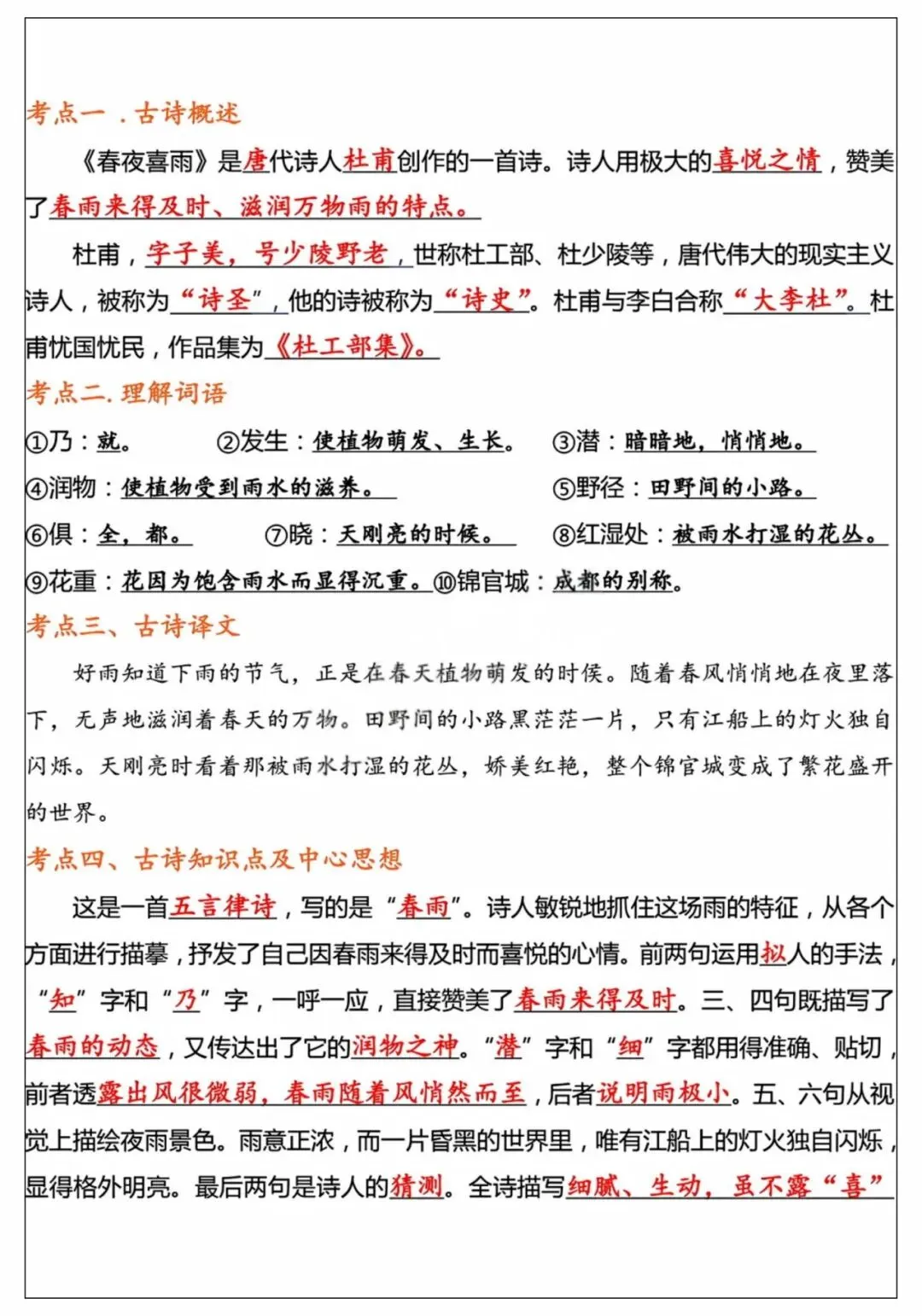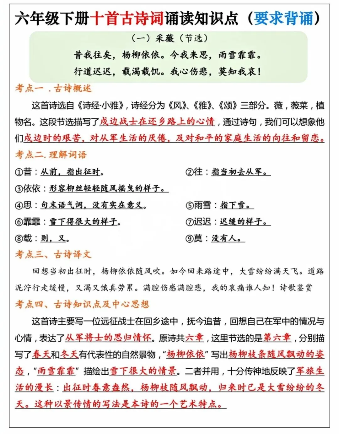 26年春季最新版六年级下册语文【十首古诗词知识点】词语解释、古诗翻译、中心思想、可打印