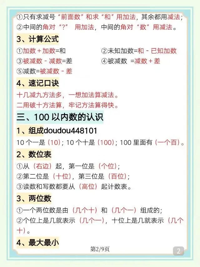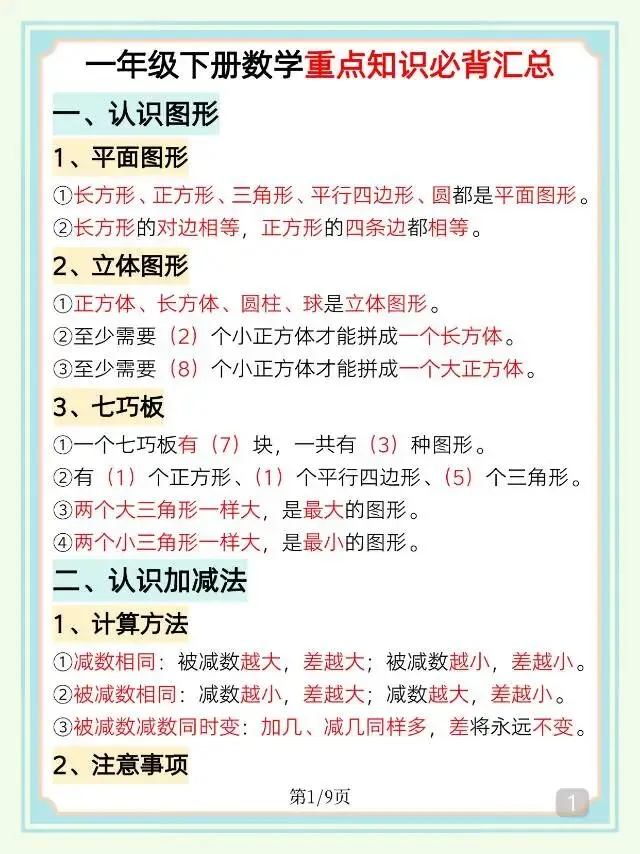 一年级下数学《重点知识必背汇总》,电子版可打印