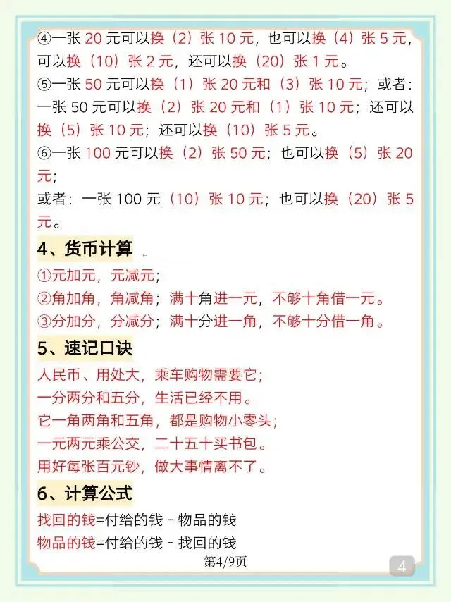 这份一年级下册数学重点知识必背汇总超实用!涵盖认识图形、加减法、100以内数的认识、人民币四大核心模块,把公式、换算规则、解题技巧和速记口诀一网打尽,知识点条理清晰、讲解直白,还有大量实用换算范例,孩子日常背记、考前复习都适配,需要的家长抓紧打印出来吧。