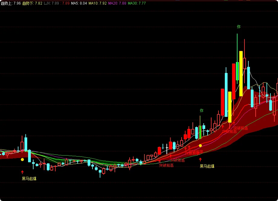 DRAWTEXT(真黑马, L*0.88, ‘黑马起爆’), COLORYELLOW;