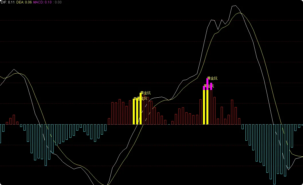 DRAWTEXT(指标迷, MACD, ‘黄金坑’), COLORYELLOW;