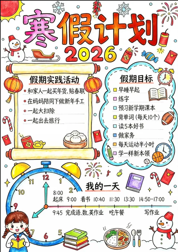 一张小小的手抄报,不仅是一份假期计划,更是孩子成长的见证~ 这个马年寒假,让孩子在动手制作中学会规划,在执行计划中收获成长,既充实又有意义!