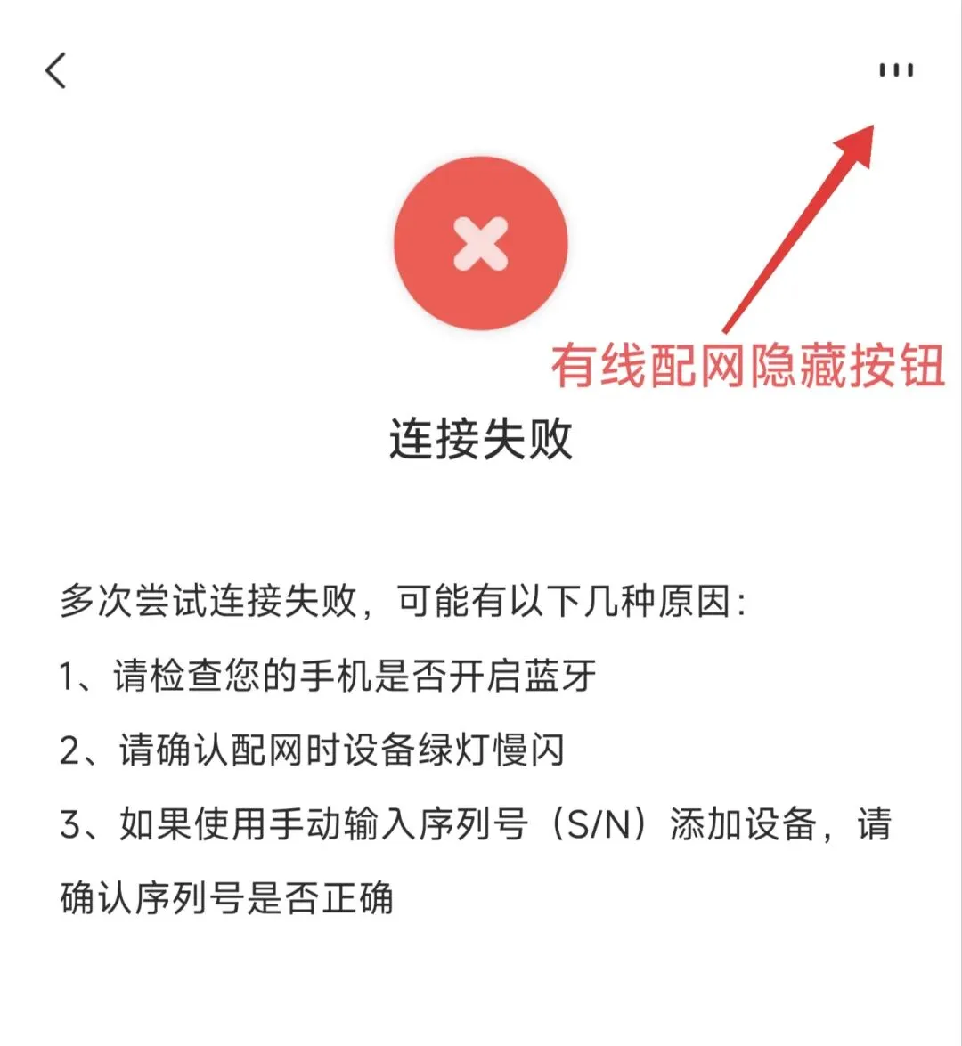 反复试了几遍,就算连接失败也没有提示你切换有线配网,最后发现有线配置隐藏按钮在右上角一个不起眼的三个点。