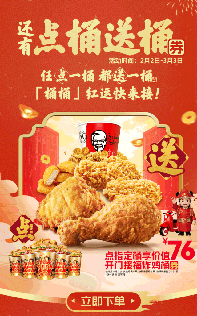 本活动自2026年02月02日至2026年03月03日,活动时间段9:30-23:00。活动期间,用户登录肯德基WOW会员后,在肯德基超级APP外送到家/肯德基宅急送微信小程序/肯德基宅急送支付宝小程序购买指定桶,可获领0元购开门接福炸鸡桶(实付满59元享,不含外送费和打包费)优惠1张,请前往肯德基APP会员卡包查看并使用。0元购开门接福炸鸡桶(实付满59元享,不含外送费和打包费)优惠券将在订单送达后72小时内发放至用户的肯德基WOW会员“我的卡包”,自领取起5小时后生效,自领取之日起14天内使用有效。每张优惠券仅限使用一次,核销后即失效。活动地区:全国。电子券具体使用规则详见“我的卡包”券说明。同一用户就本活动电子券每张仅限领取1次。每单仅限使用一张优惠券。 电商团购券核销单不参与本活动。同一ID、同一设备、同一手机号、同一支付账户、同一取餐联系电话、同一送餐联系电话、同一送餐地址,均视为同一用户。对于任何通过不正当手段(包括但不限于作弊、通过机器行为等方式恶意刷单)参加活动获取权益或者不符合活动规则的行为,我们将在不事先通知的前提下取消该用户参与活动的资格和已获得的相应权益。外送部分送餐区域不供应本产品,详情以输入地址后显示的菜单及送餐时间为准,外送费及打包服务费需自理。除推广产品外,其他物品仅做装饰目的,图示内容仅供参考。产品、周边、玩具及包装以实物为准。不与其他优惠共享。堂食、肯德基宅急送自有渠道、第三方外卖平台外送渠道、甜品站、团购渠道、企业送渠道以及其他渠道的产品组合、价格以及优惠活动,以各渠道页面展示为准。