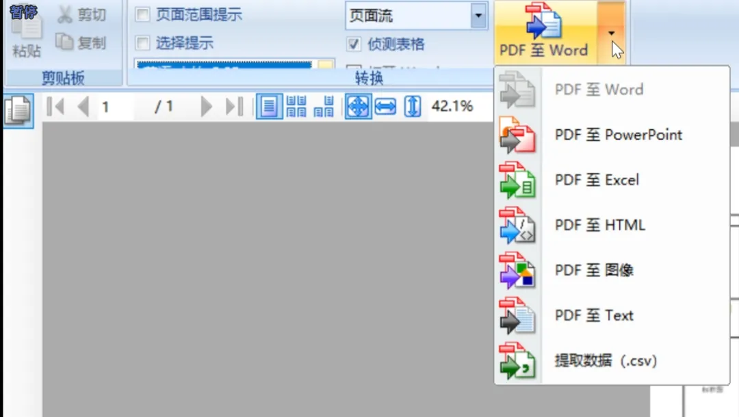 导入完成后,点击软件左上角选择转换的文件格式,这里支持把PDF文件转换成word、PPT、excel、HTML、图片等各种格式。