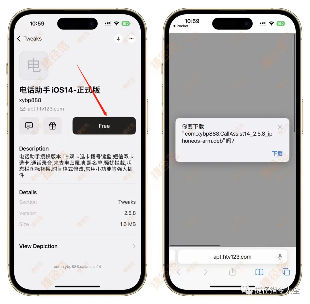 添加好越狱源之后.就可以下载自己想要的文件了.我们以电话助手为例(仅仅可以提取为了演示.这款是收费插件哦 只有越狱之后才能使用).源地址http://apt.htv123.com 添加之后.就可以点击进去就能看到他源里的所有文件.点击Free 然后下载或者提取 即可