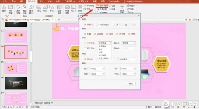 如果制作PPT的时候不小心用了有版权的字体,或者领导觉得字体太丑啦,怎样能迅速换掉它们呢?