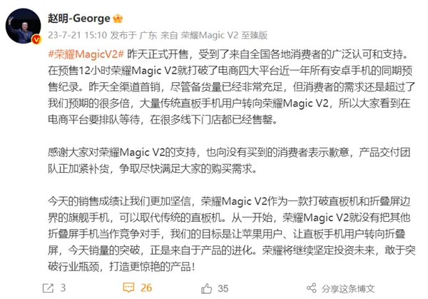 荣耀 CEO 赵明今日在微博上透露,荣耀 MagicV2 昨天正式开售,预售 12 小时就打破了电商四大平台近一年所有安卓手机的同期预售纪录。(来源:快科技)