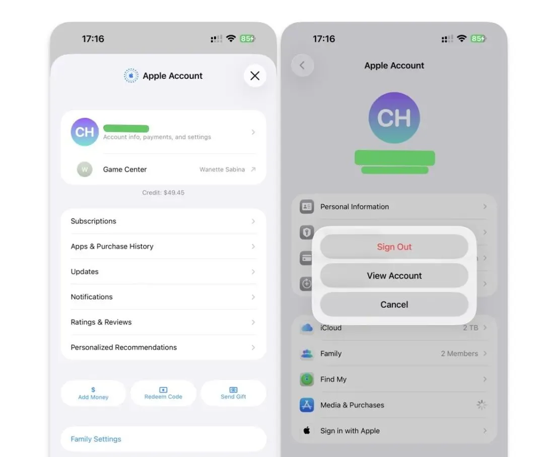 设置 → 你的名字 → iCloud → 媒体与购买 → 退出登录