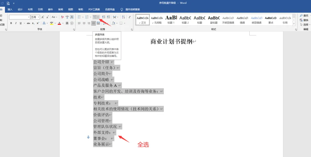 要实现标题自动编号,第一步是开启Word中的多级列表功能。先全选文档内容,为后续批量操作做好准备。