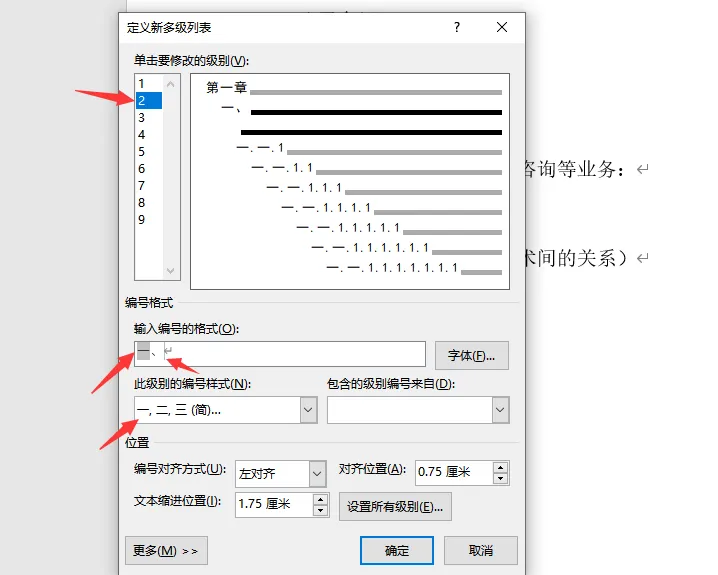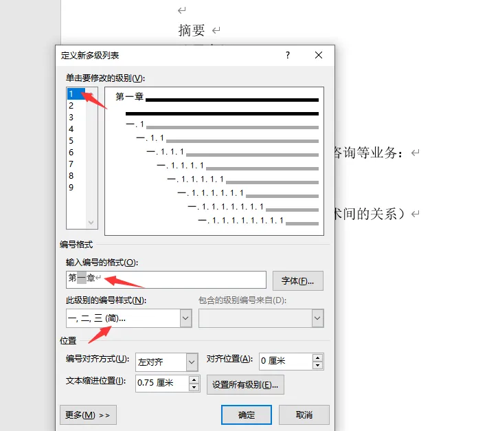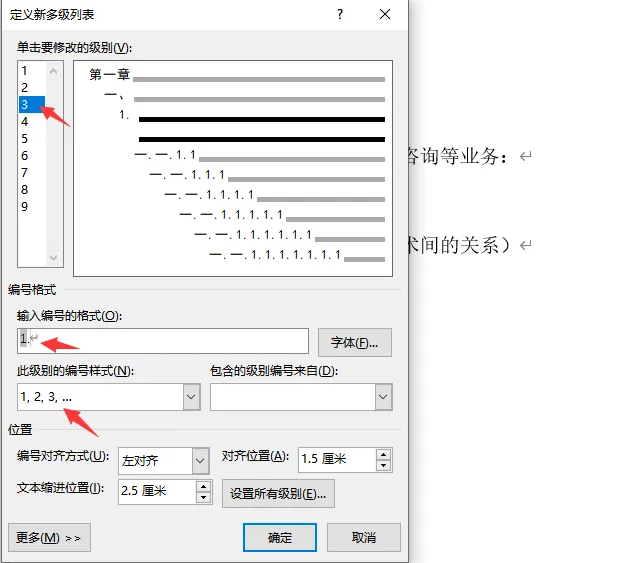 这时,可再次打开“定义新的多级列表”界面,对相应级别进行编号样式的调整。调整完成后,点击确定,文档中的编号就会按照新的要求更新,让文档编号更加完美无缺。
