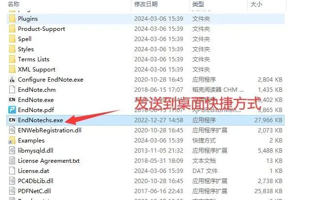 9、把复制进去的Endnotechs.exe文件,右键点击,发送到桌面快捷方式,这个时候就可以在桌面打开软件的中文版了。
