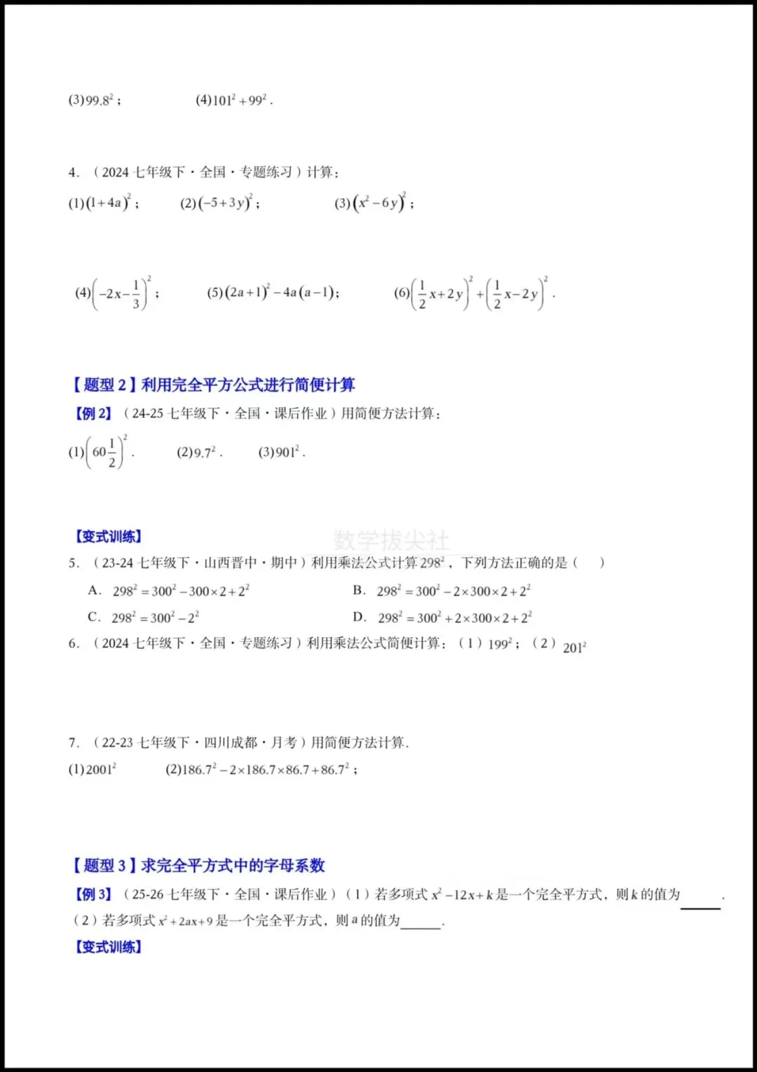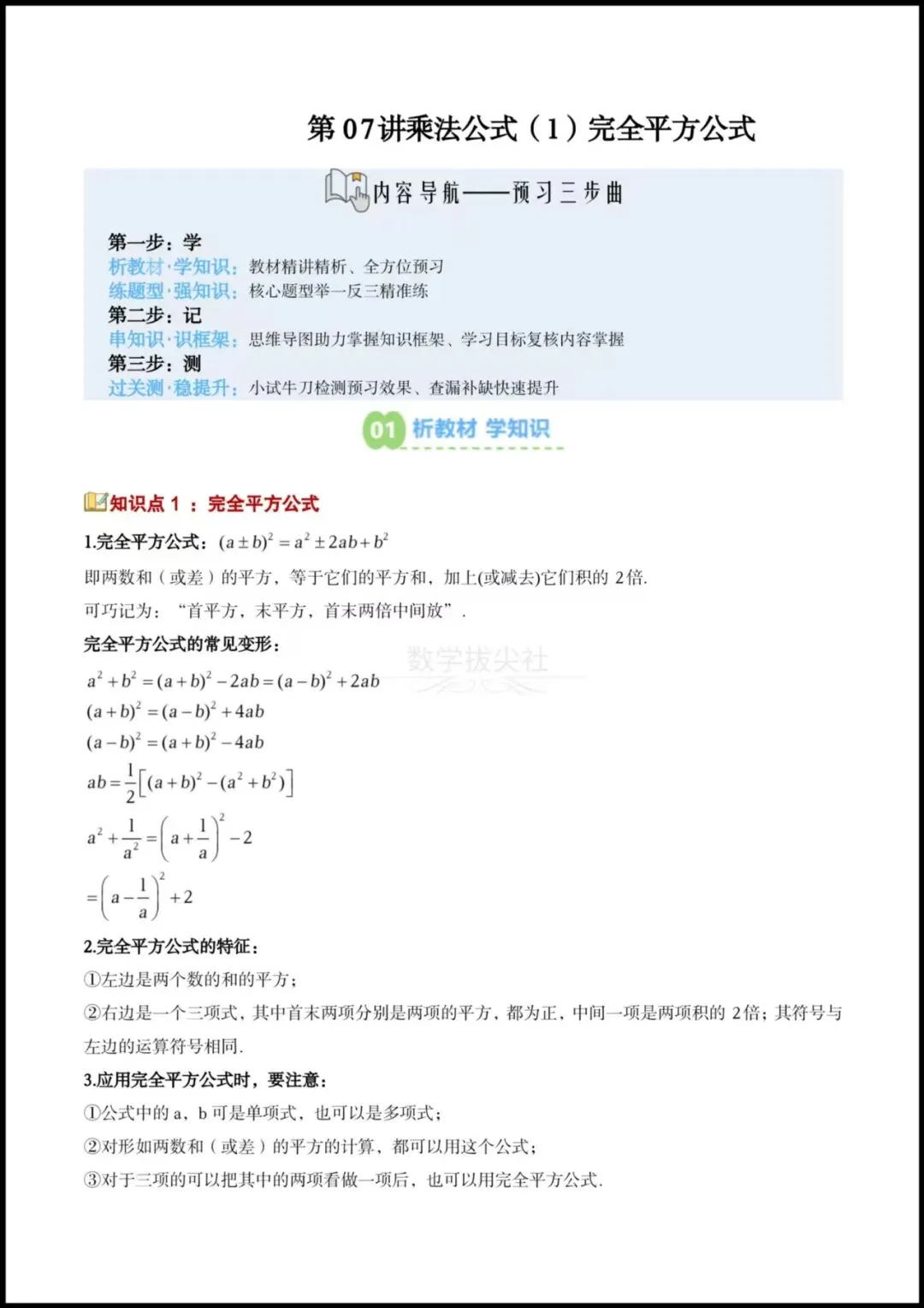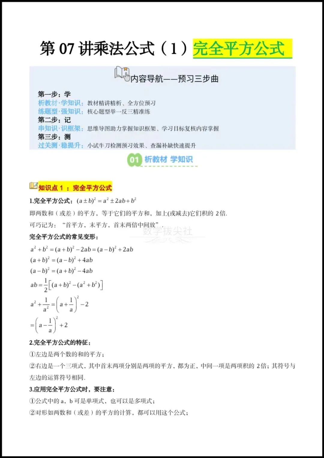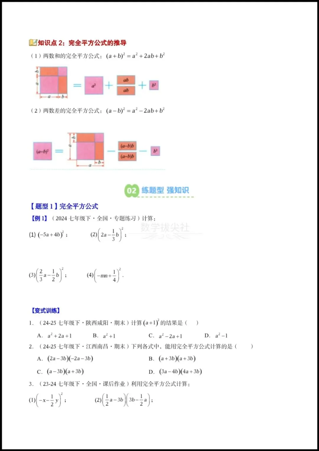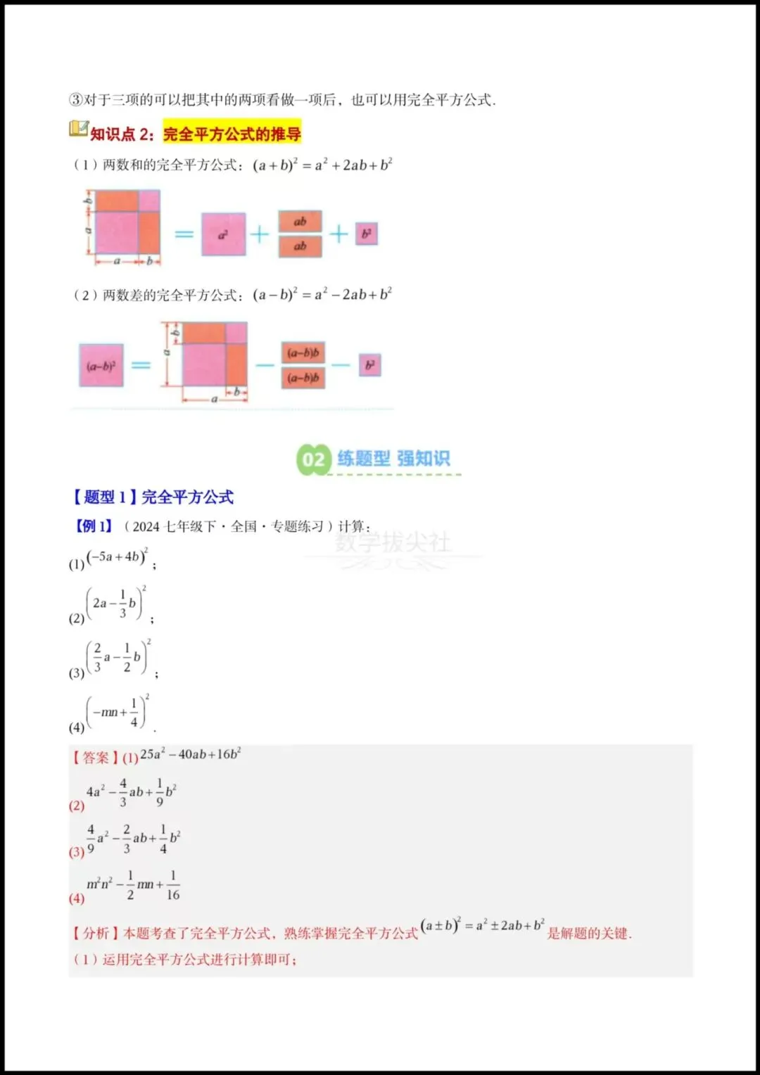 今日分享:👉2026春新版【苏科版】七年级下册〈数学〉寒假预习讲义《完全平方式》2大知识点+8大题型,有解析。