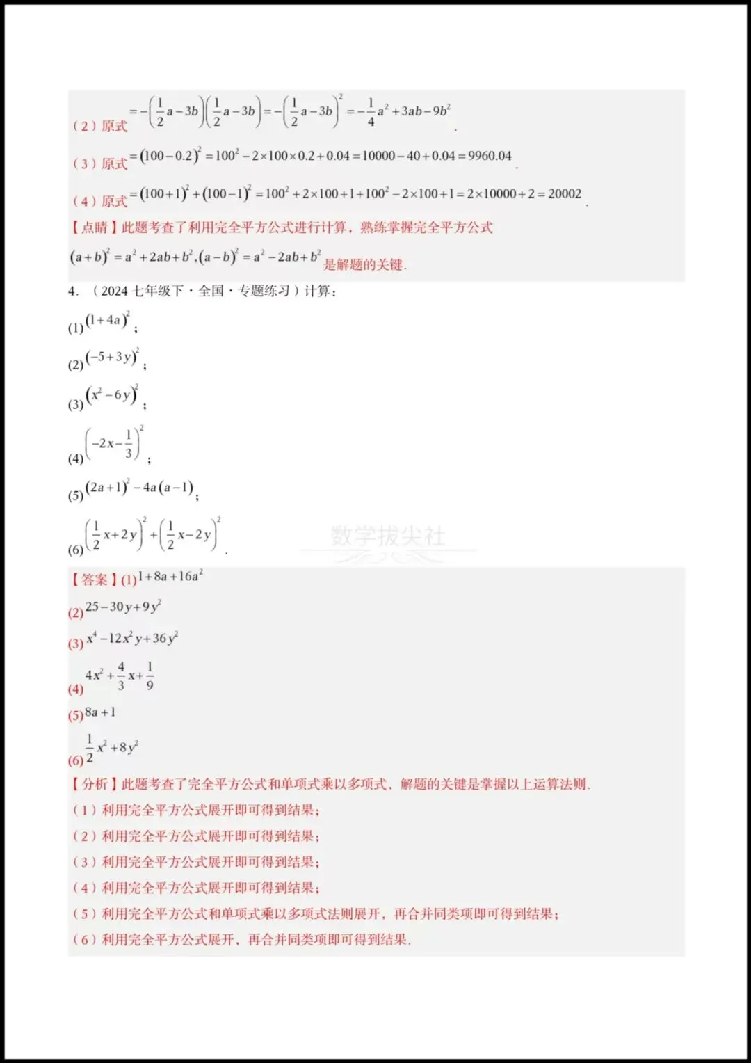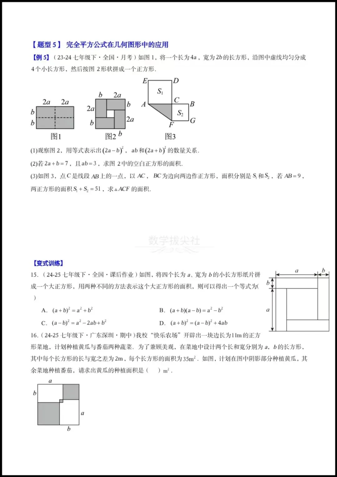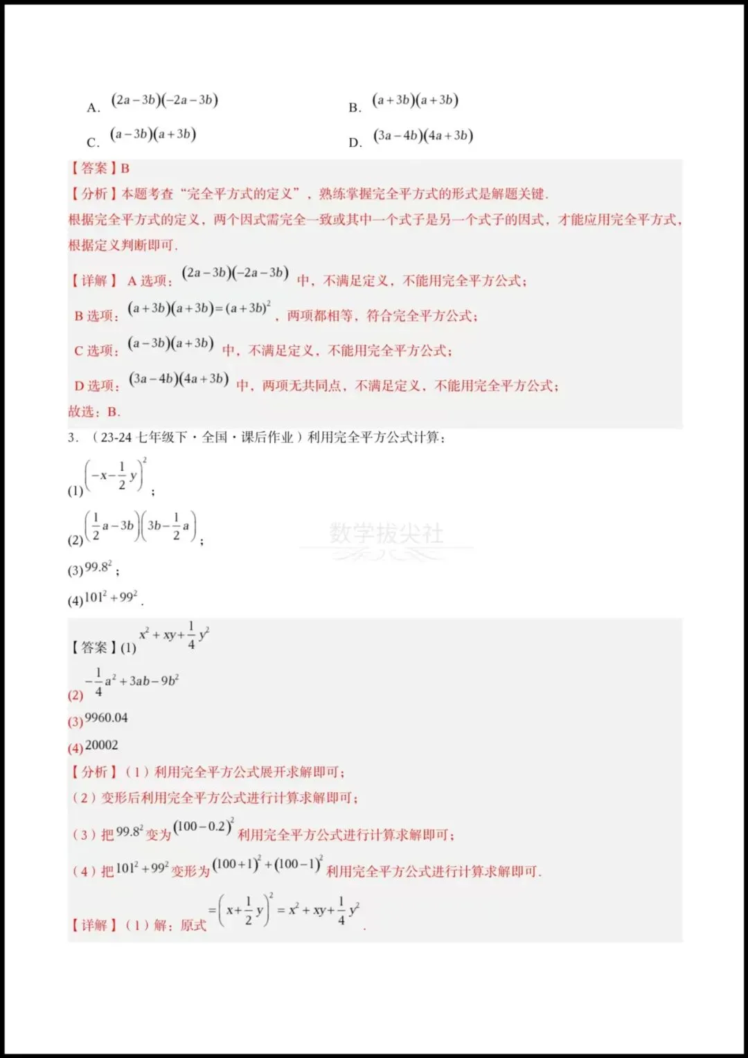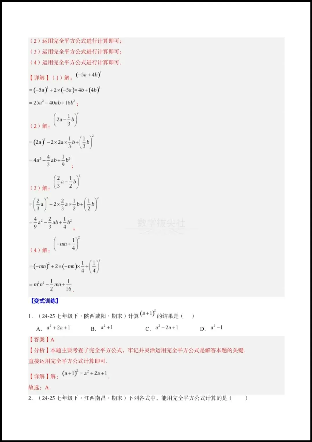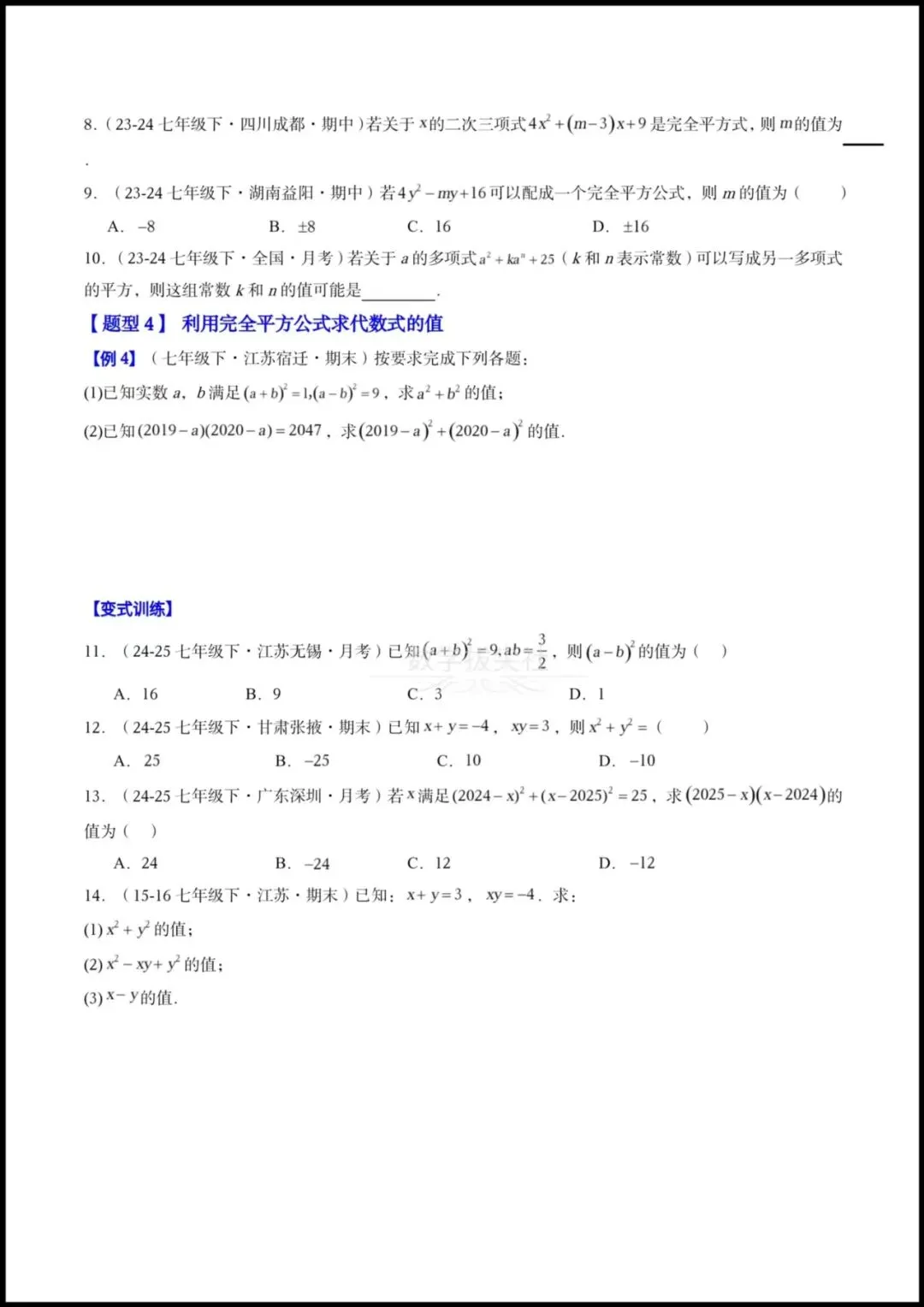 今日分享:👉2026春新版【苏科版】七年级下册〈数学〉寒假预习讲义《完全平方式》2大知识点+8大题型,有解析。