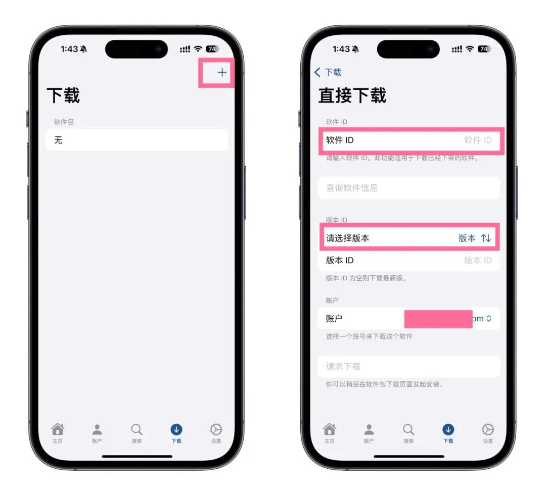 在下载里面点击右上方+ 输入软件ID 选择版本就能下载,前提是我们的账号之前下载过这个应用,这里我也转发一下其他大佬给我们整理的软件ID有需要的可以安装。