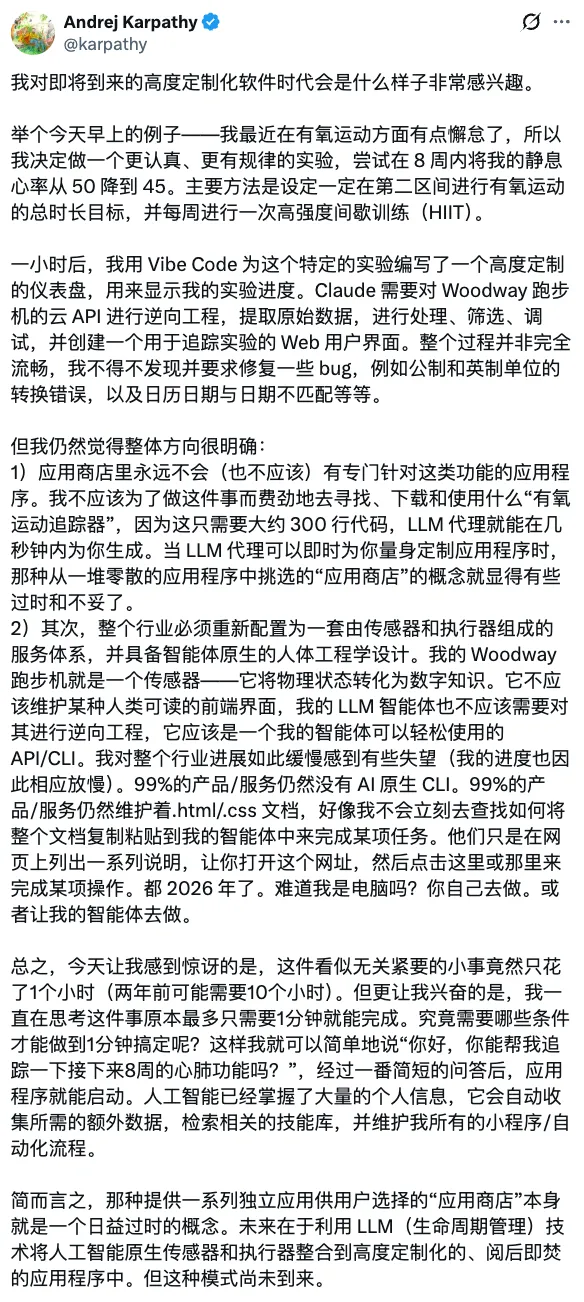 对于没有编程基础的用户来说,复杂功能定制化依旧很难,比如在这个示例中Karpathy对跑步机云API做的逆向工程,或者像openclaw创始人为了解决要一直在线的问题,做的openclaw。