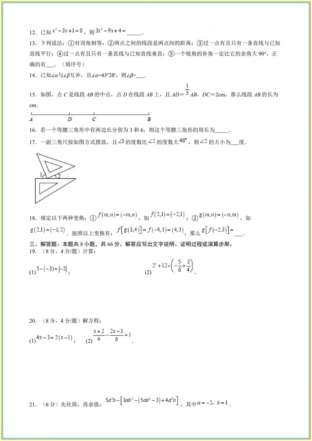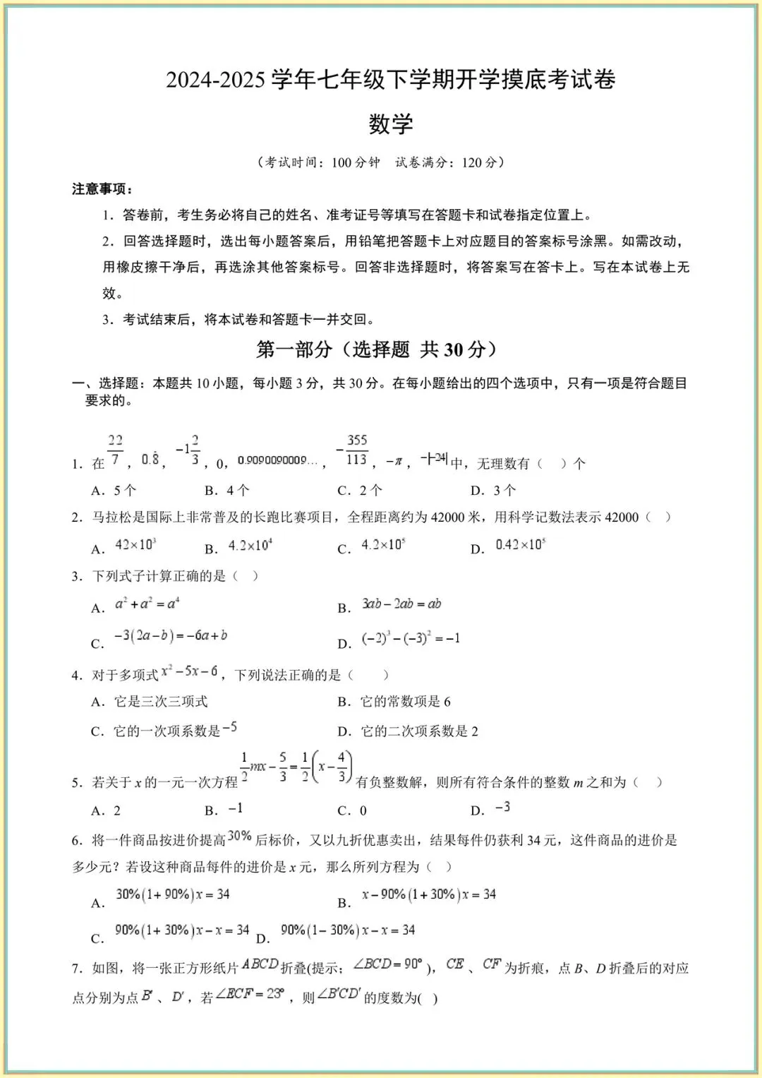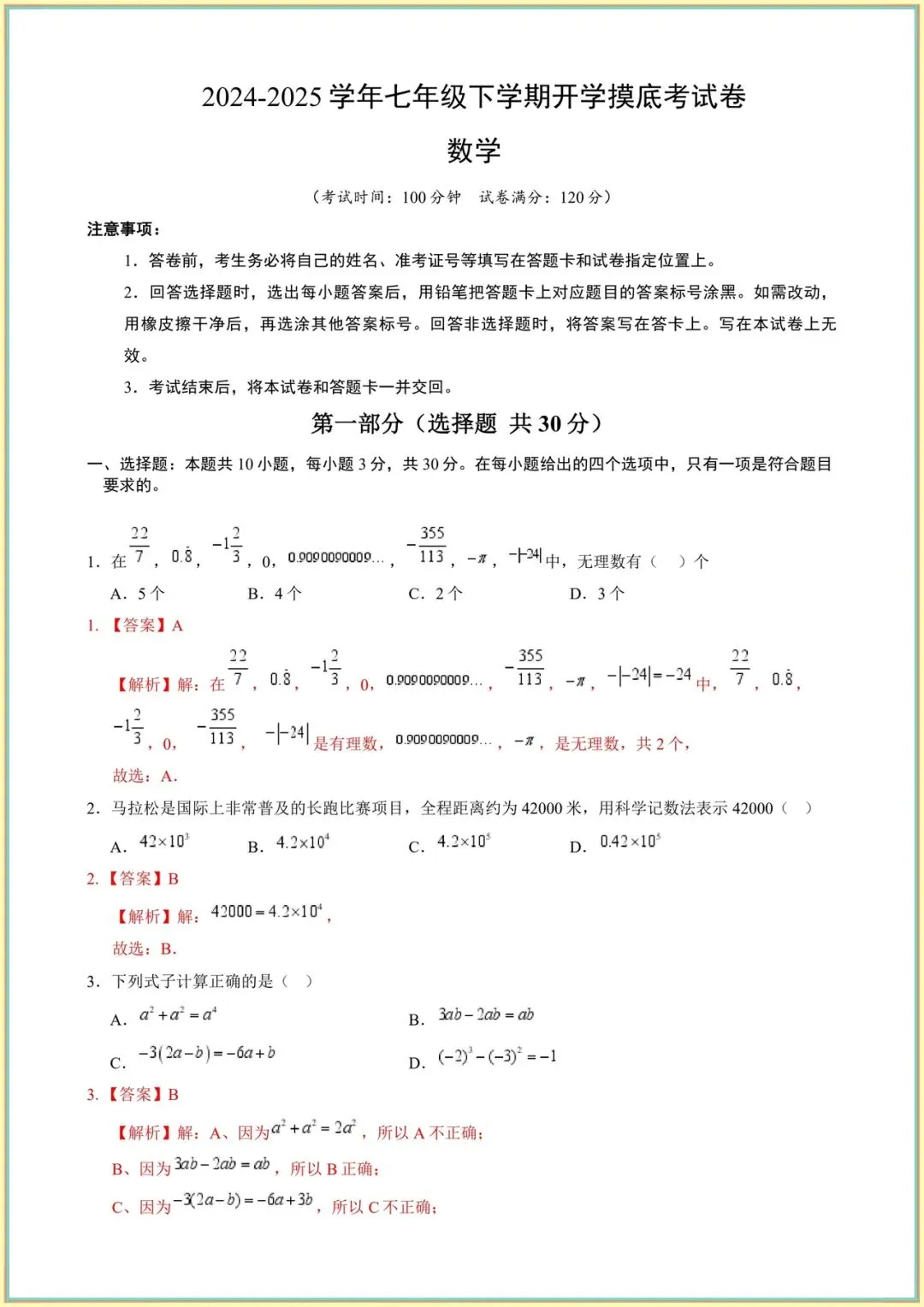 2026新(苏科版)七年级下册数学开学摸底考卷完整电子版可打印!