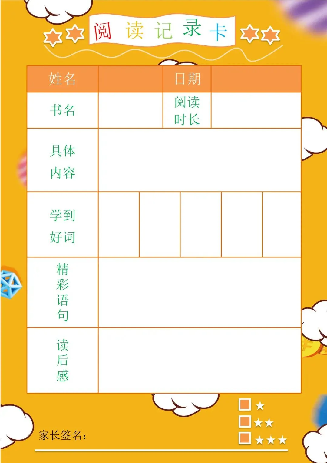 小学阅读记录卡
