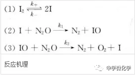 对峙反应、平行反应和连续反应由有限个基元反应组成的,是常见的反应机理见的反应机理,它们是构成更复杂反应机理的基础模型。举例,如氧化亚氮在碘蒸气存在时的热分解反应:2N2O→2N2+O2。