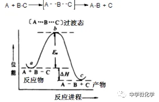 ①以上为一种基元反应,其中正反应活化能Ea正=b-a,逆反应活化Ea逆=b-c,ΔΗ=Ea正-Ea逆;②过渡态(A…B…C)不稳定