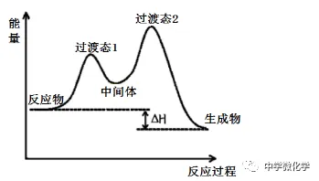 处于能量最高点的是反应的过渡态,在多步反应中两个过渡态之间的是中间体,中间体很活泼,寿命很短,但是比会比过渡态更稳定些。