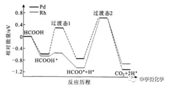 例如下图中,从第一个中间态到过渡态2的能量就是能垒,而HCOO*+H*=CO2+2H*是在Rh作催化剂时该历程的决速步骤。