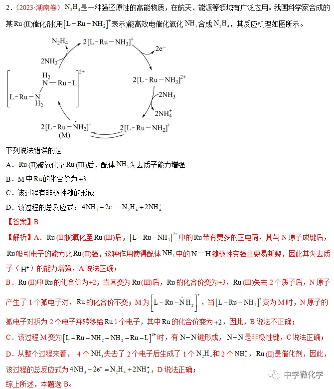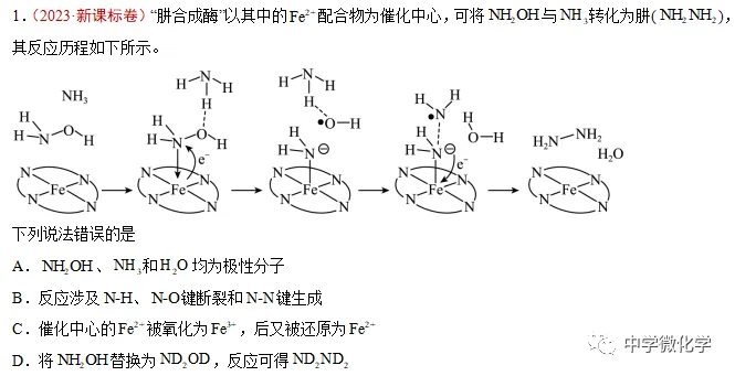 D.由反应历程可知,反应过程中,生成的NH2NH2有两个氢来源于NH3,所以将NH2OH替换为ND2OD,不可能得到ND2ND2,得到ND2NH2和HDO,D错误;