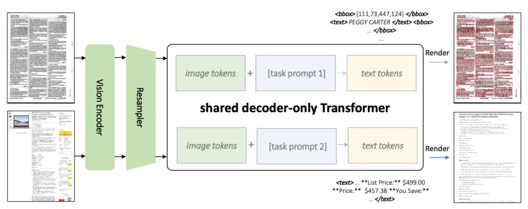 第一个任务涉及生成具有空间感知的文本块,即同时生成文本块的内容与坐标框;