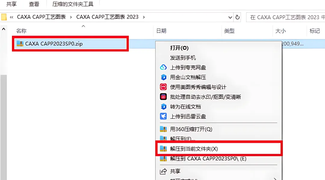 1.下载CAXA CAPP工艺图表 2023软件安装包到电脑上,右键选择【解压到当前文件夹】。