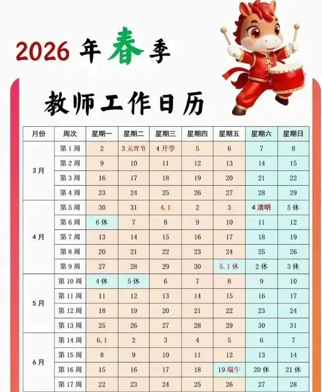 今天小编给大家分享的是:2026年春季学期教师工作日历。