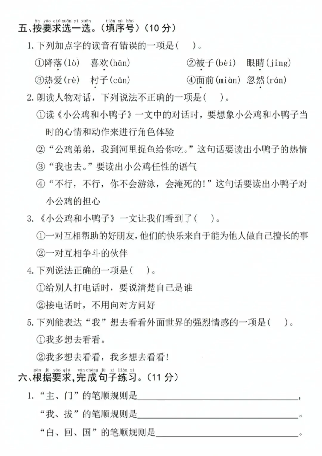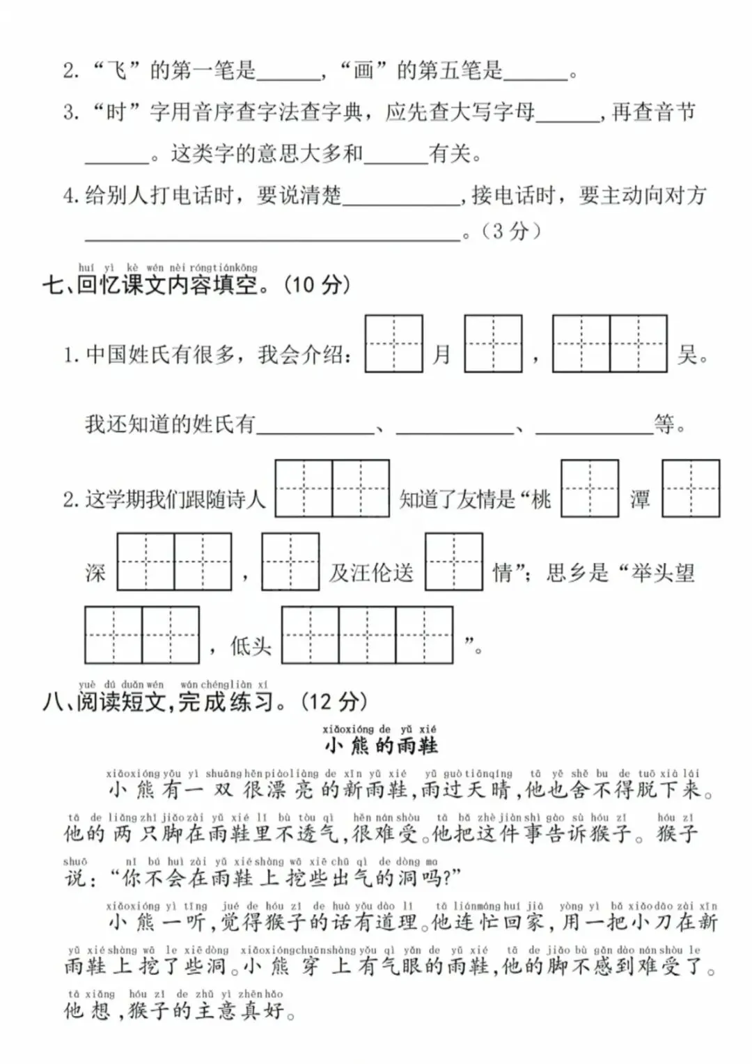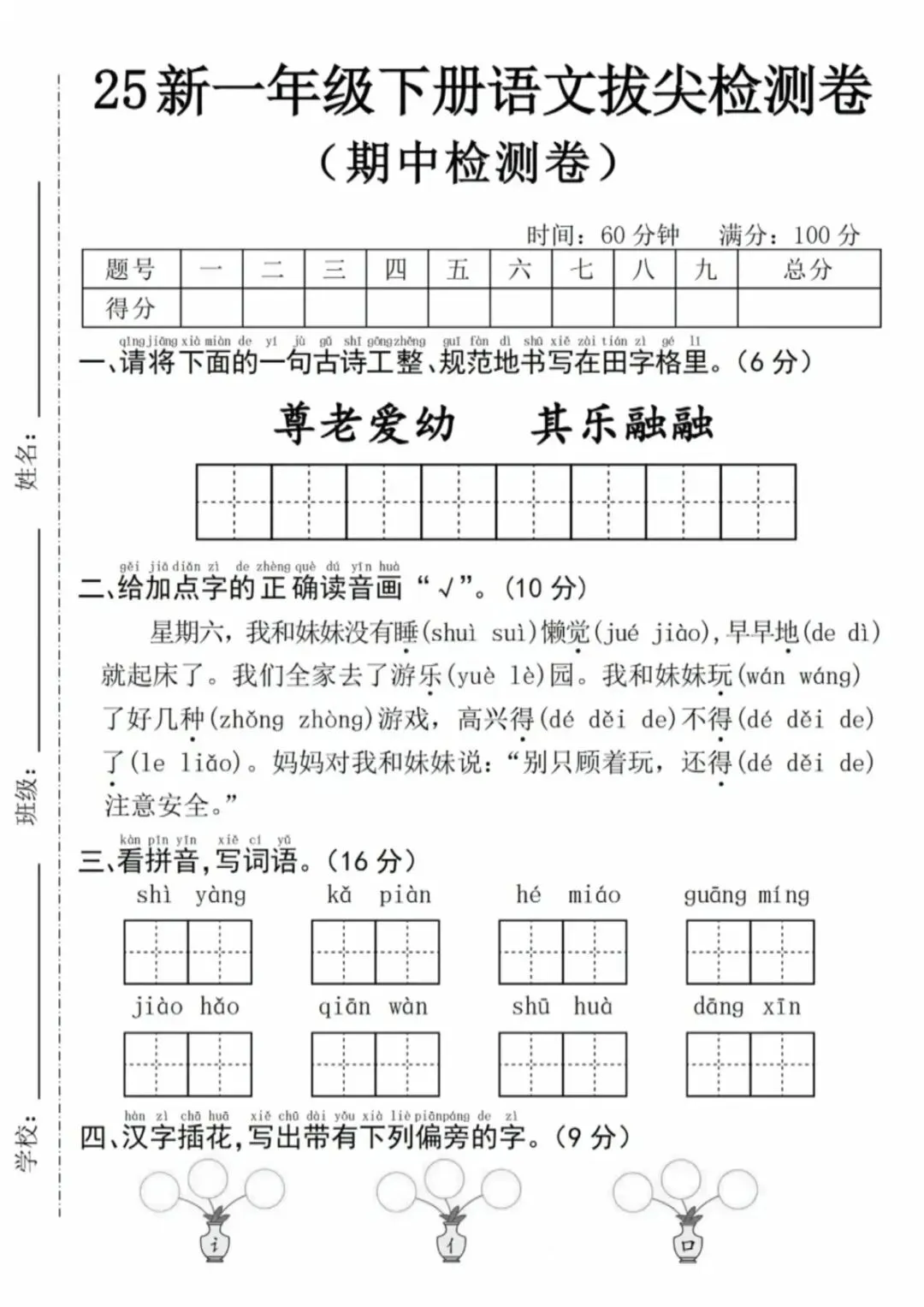 【免费下载】一年级(下)语文 期中拔尖测试卷13
