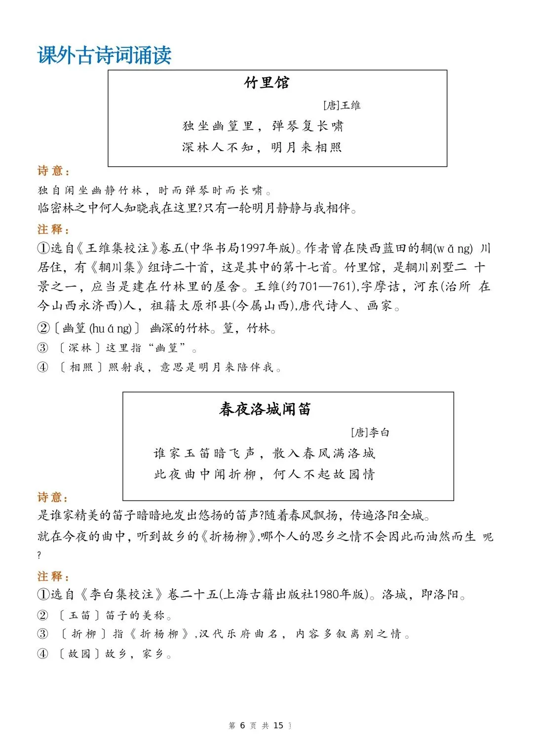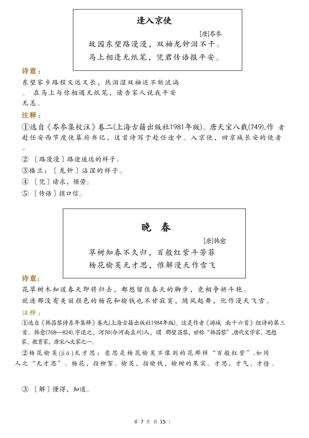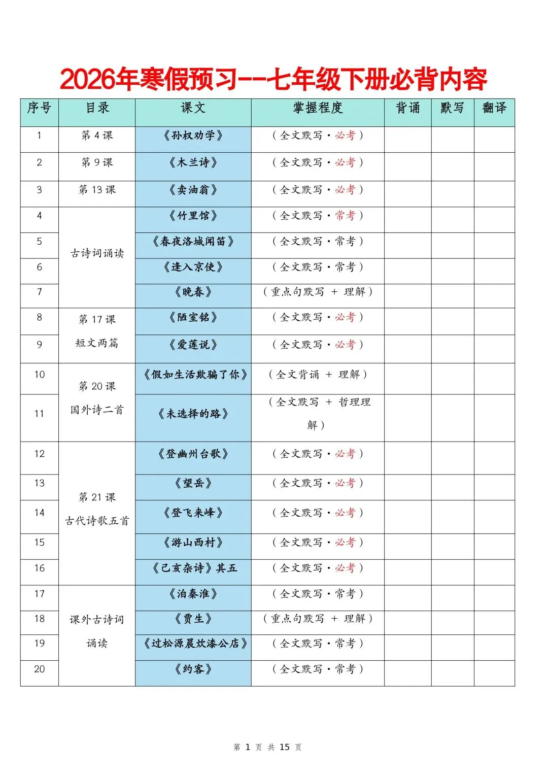 2026春人教部编版七年级下册语文寒假预习必背内容汇总+注释译文(含必背课文、古诗词、文言文)完整电子版可打印。