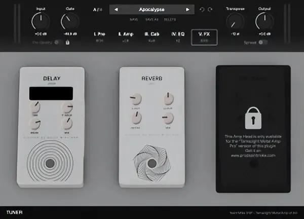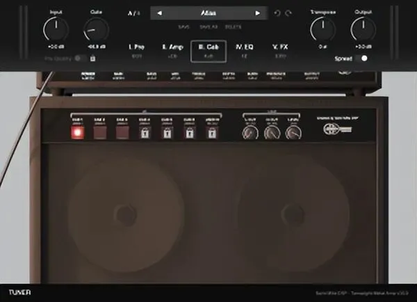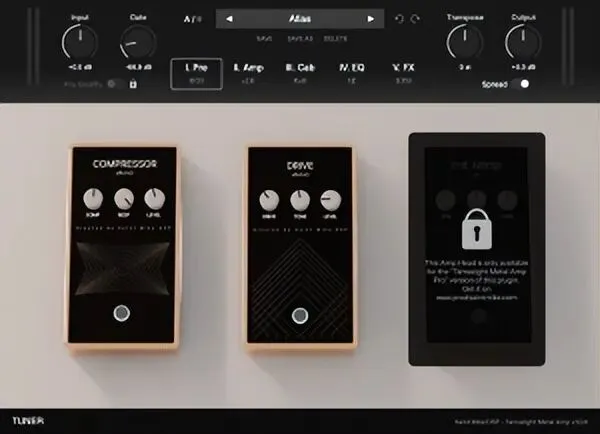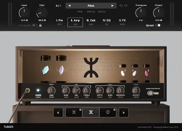 Tamazight Metal Amp 免费插件却拥有 Pro 套件才具备的完整工作流程。这包括用于精准节奏演奏的精确噪声门、带输出静音功能的内置调音器,以及用于即时降调和创意音高变换的移调旋钮(±12个半音)。