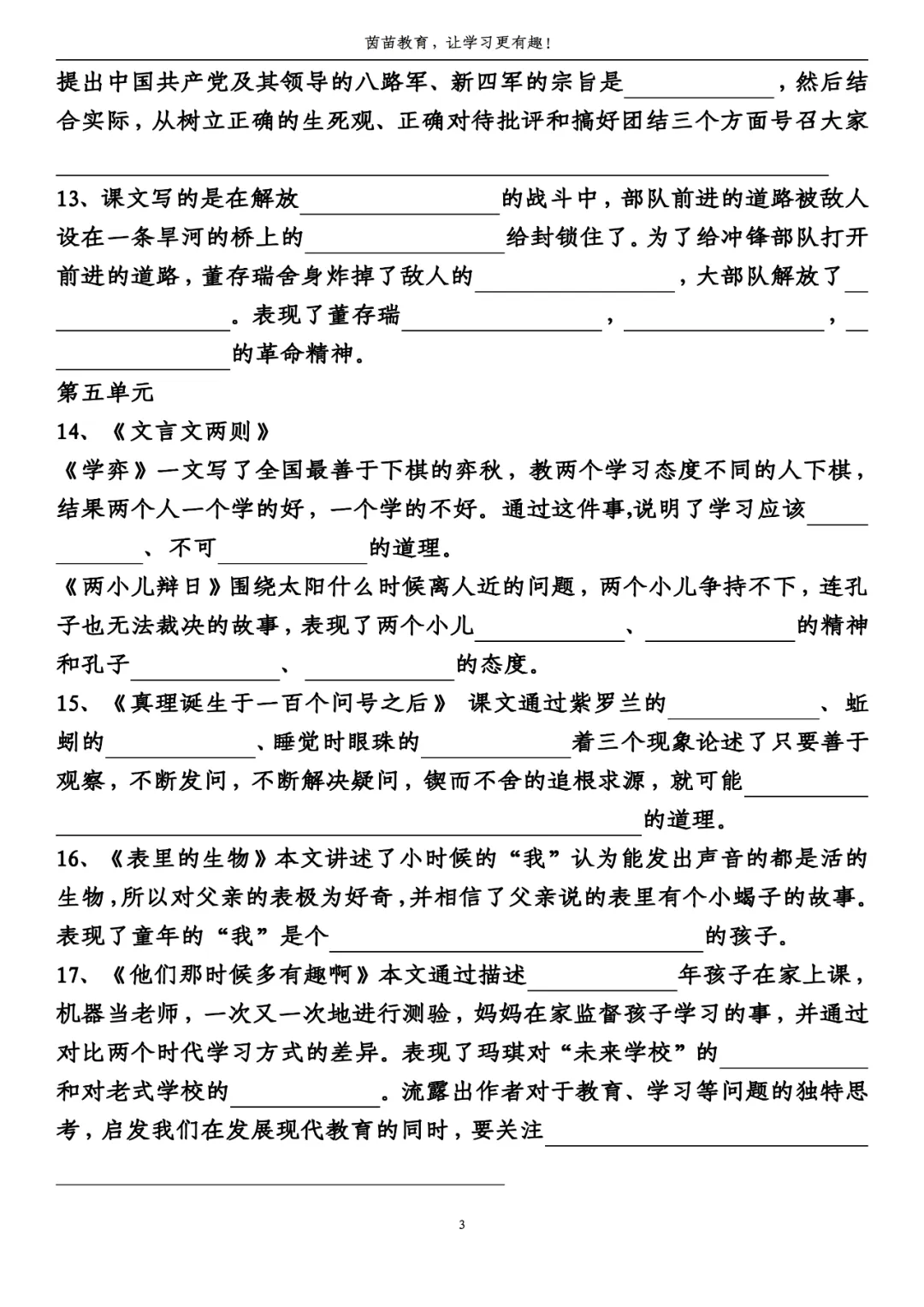 16、《表里的生物》本文讲述了小时候的“我”认为能发出声音的都是活的生物,所以对父亲的表极为好奇,并相信了父亲说的表里有个小蝎子的故事。表现了童年的“我”是个天真无邪、善于观察和思考,对事物有着强烈的好奇心和旺盛的求知欲的孩子。