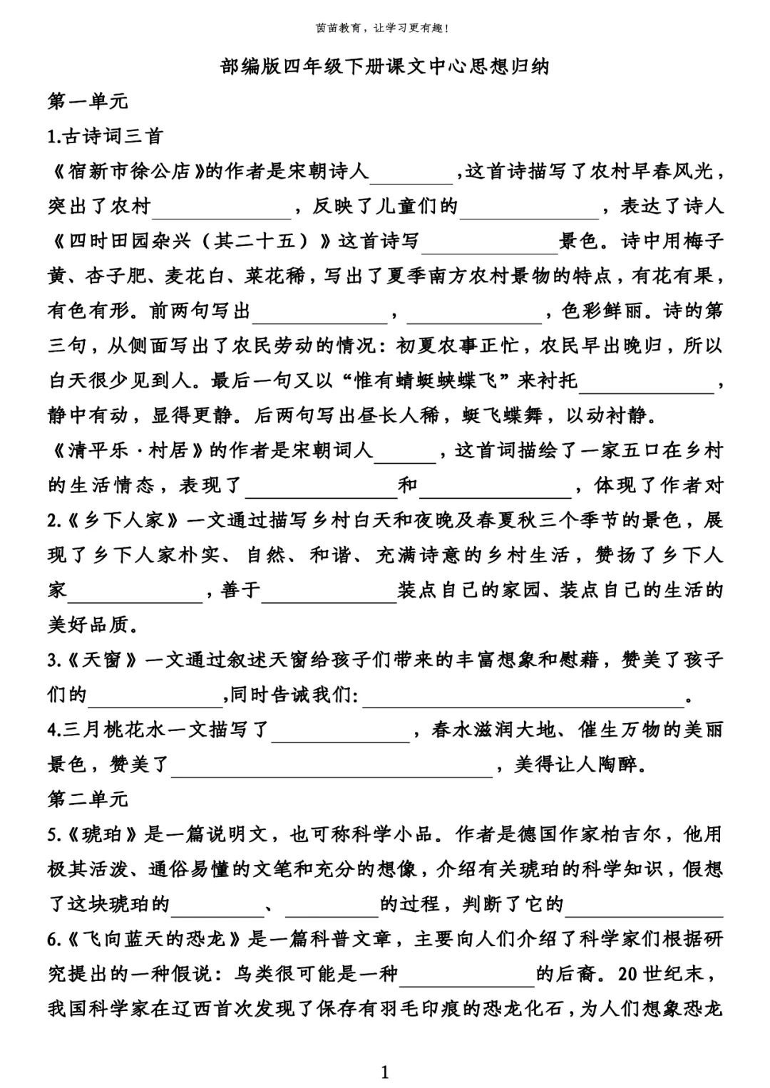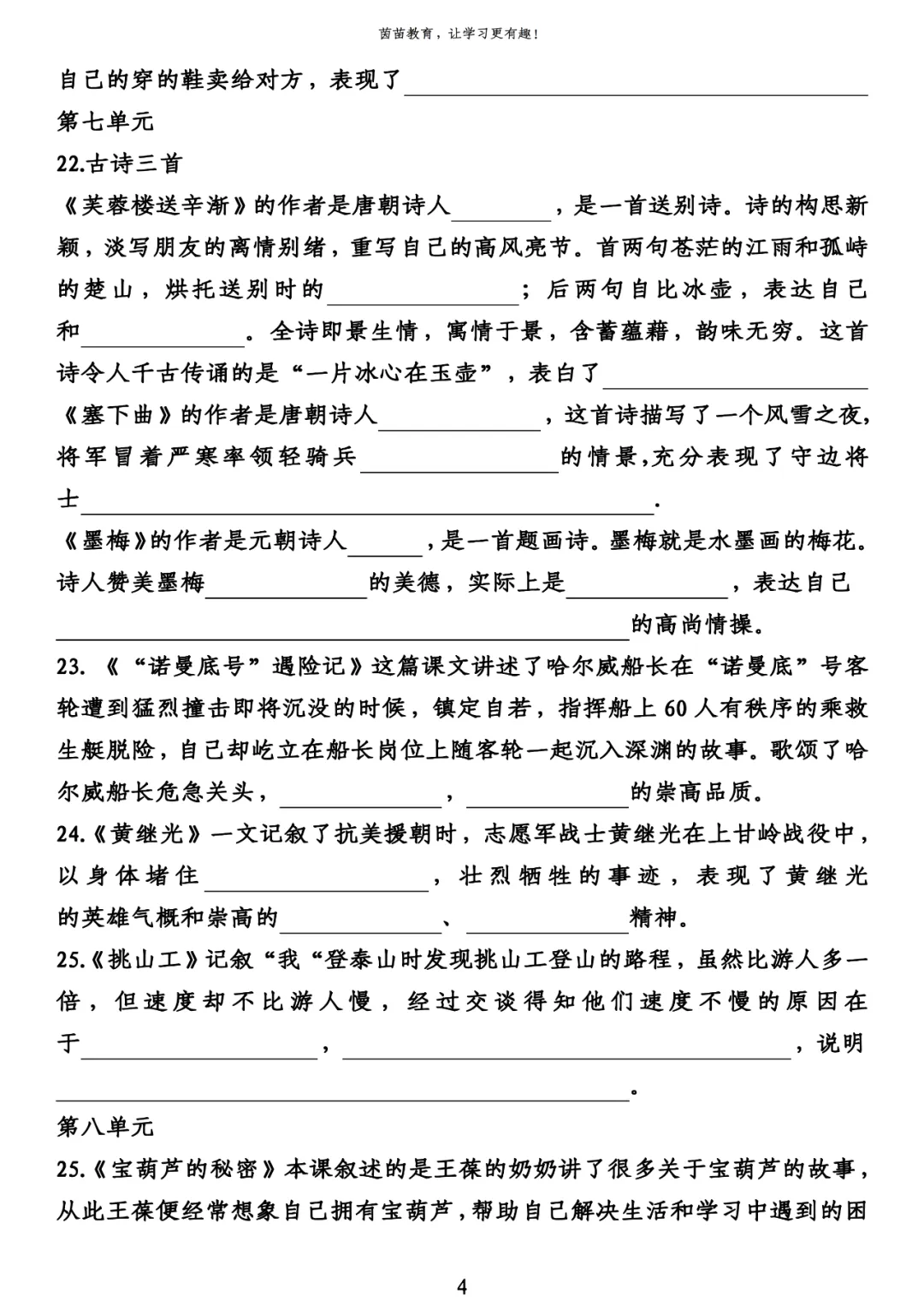 四年级下册语文中心思想归纳填空练习PDF下载