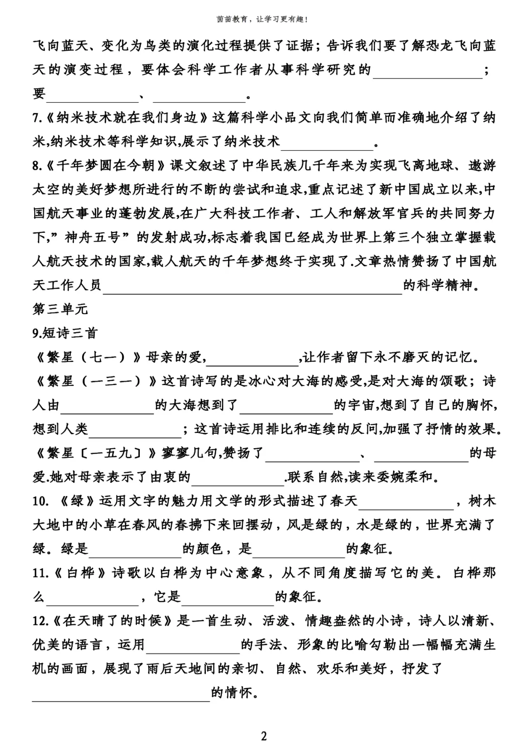 12.《在天晴了的时候》是一首生动、活泼、情趣盎然的小诗,诗人以清新、优美的语言,运用拟人的手法、形象的比喻勾勒出一幅幅充满生机的画面,展现了雨后天地间的亲切、自然、欢乐和美好,抒发了亲近自然、热爱生活的情怀。