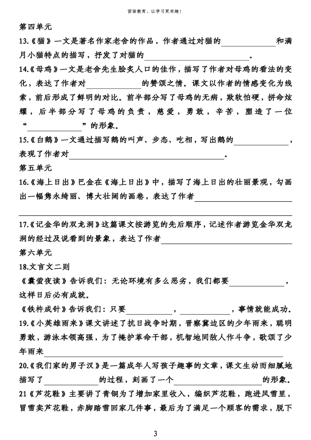 14.《母鸡》一文是老舍先生脍炙人口的佳作,描写了作者对母鸡的看法的变化,表达了作者对母爱的赞颂之情。课文以作者的情感变化为线索,前后形成了鲜明的对比。前半部分写了母鸡的无病,欺软怕硬,拼命炫耀,后半部分写了母鸡的负责,慈爱,勇敢,辛苦,塑造了一位“伟大的鸡母亲”的形象。