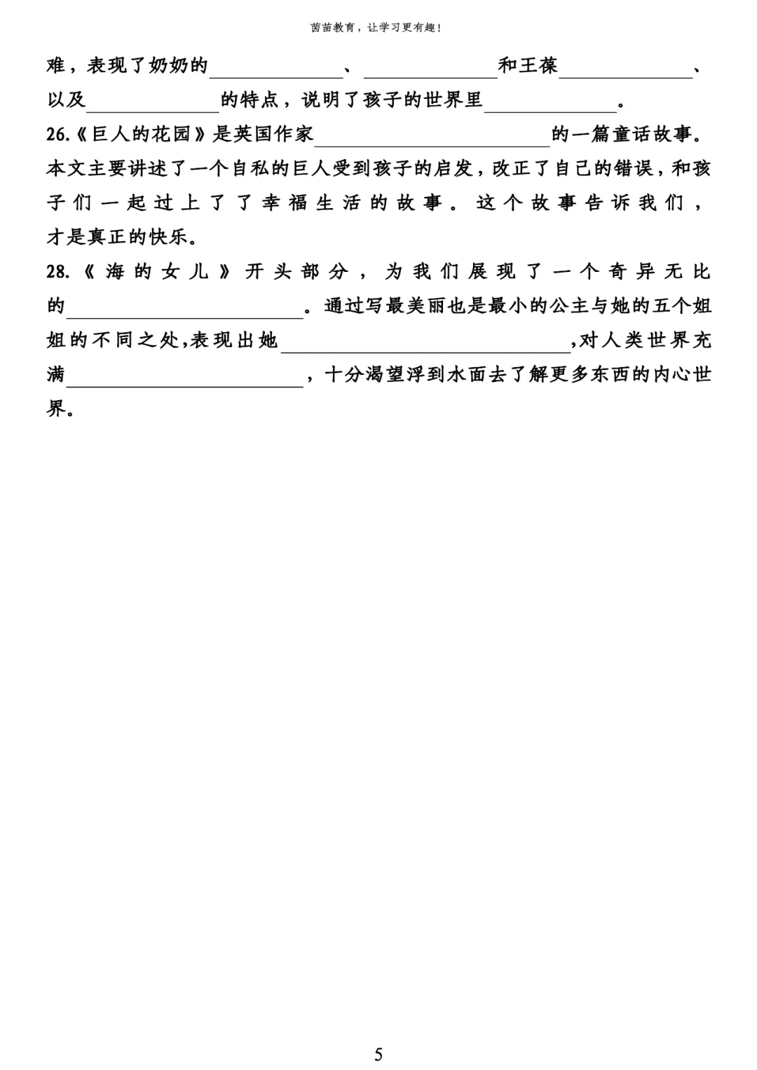 27.《巨人的花园》是英国作家王尔德的一篇童话故事。本文主要讲述了一个自私的巨人受到孩子的启发,改正了自己的错误,和孩子们一起过上了了幸福生活的故事。这个故事告诉我们,能和大家一起分享的快乐才是真正的快乐。