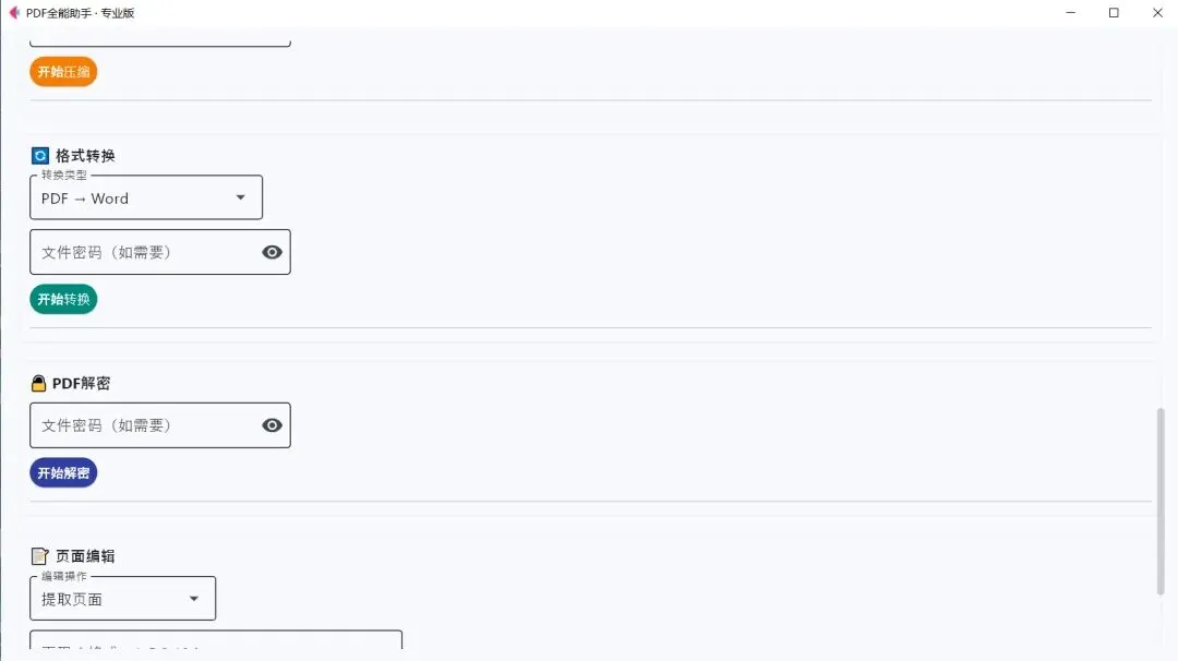 合并、拆分、加水印、压缩、解密、页面编辑、格式互转(PDF↔Word、PDF↔图片、图片→PDF)