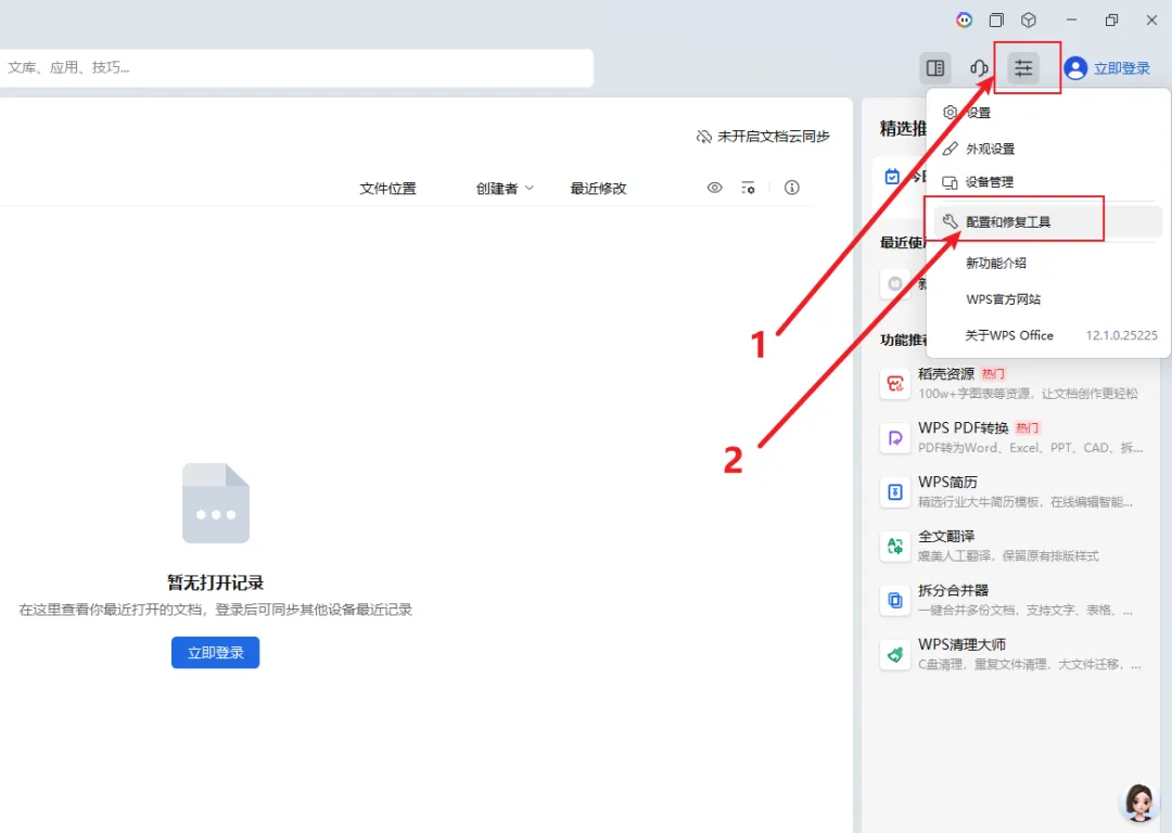 首先打开电脑上的WPS Office软件,在界面右上角找到三条杠的“菜单”按钮,点击后选择“配置和修复工具”。