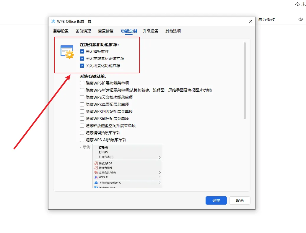 进入“配置和修复工具”后,点击“高级”,再点击“功能定制”选项。在这里,顺手把“在线资源和功能推荐”下的几个广告相关选项关闭,从此和烦人的WPS广告说拜拜。