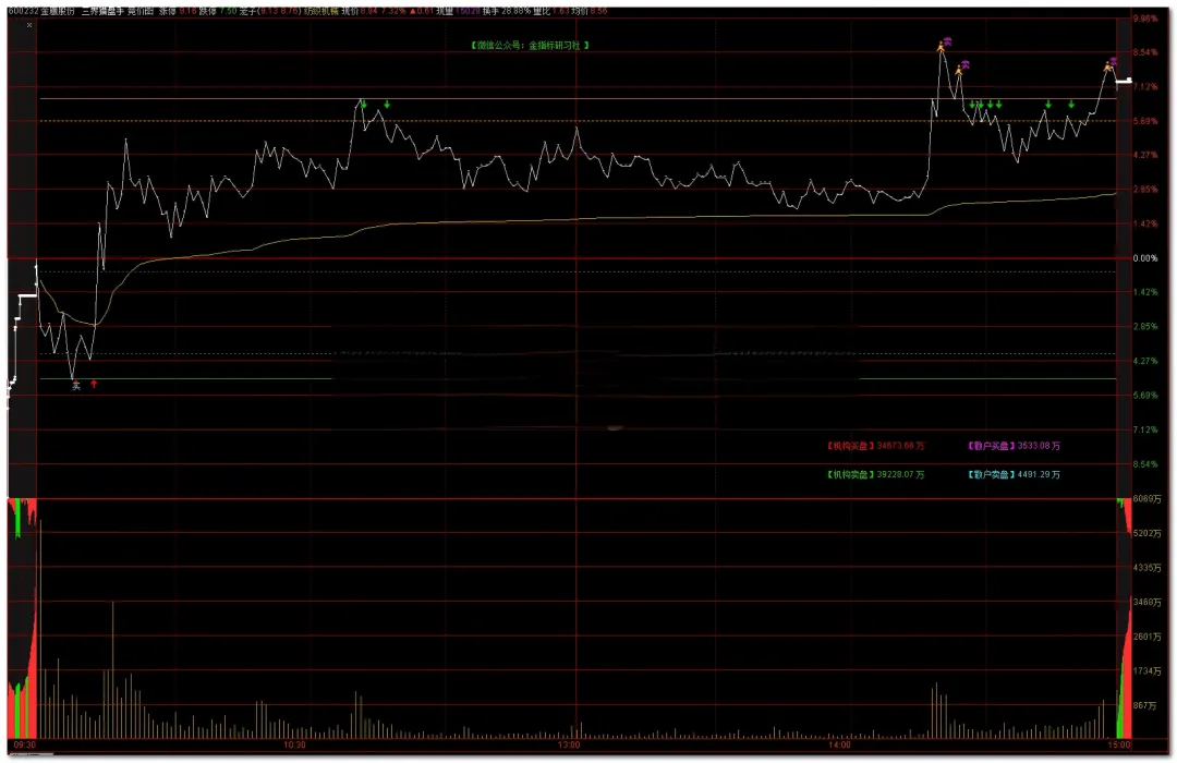 条件 :股价急拉,但右下角显示**“散户买盘”剧增**,而**“机构卖盘”也在增加**。操作 :这就是典型的“拉高出货”,千万别追!指标通常会在高位画出压力线,这时候是最好的离场时机。