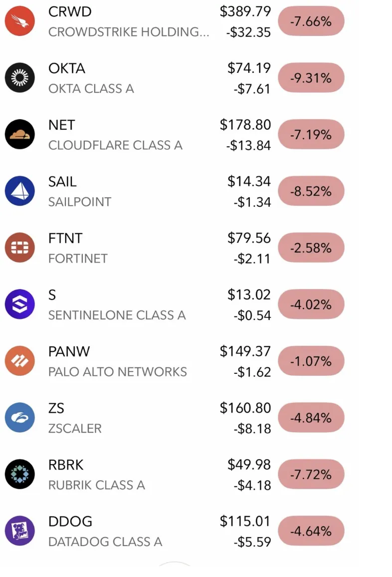 CrowdStrike 跌 6.5%,Cloudflare 跌 6%,Okta 跌 5.7%,Zscaler 跌 3.5%。总市值一夜蒸发超过 100 亿美金。