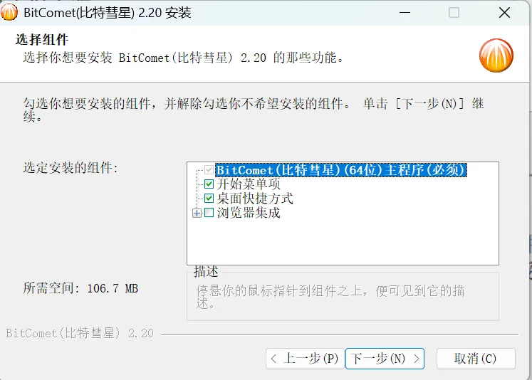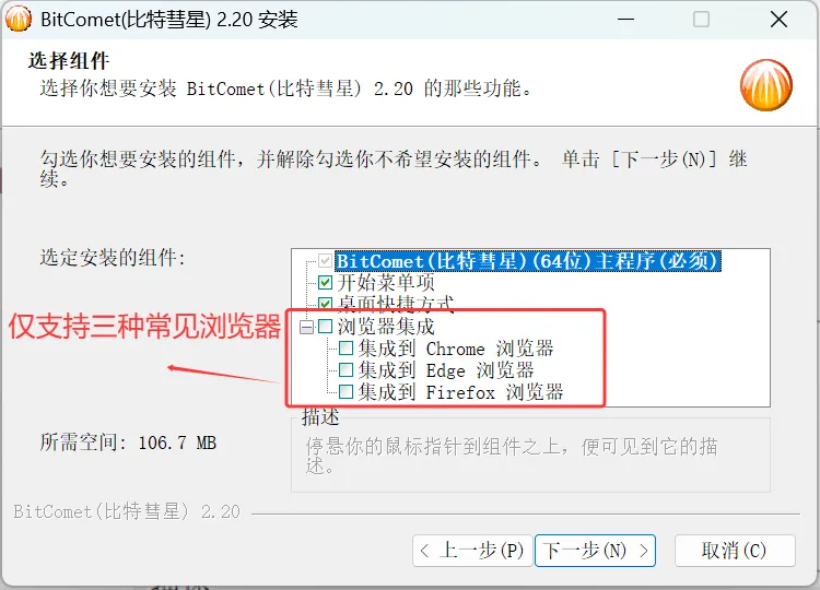 这里需要注意的是,若希望通过浏览器自动拉起 BitComet 下载,则需勾选浏览器集成,目前其仅支持常见的三种浏览器,大家按需勾选即可: