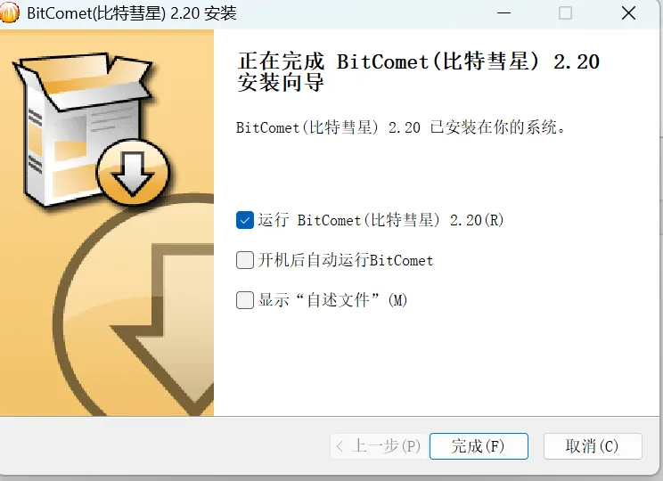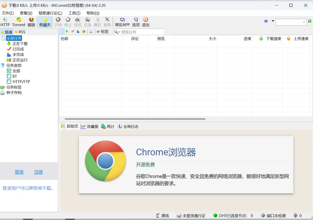 接着点击“完成”便会完成安装。若勾选了“运行BitComet(比特彗星)” 选项,则会自动运行该程序。运行后的程序主页面如下所示: