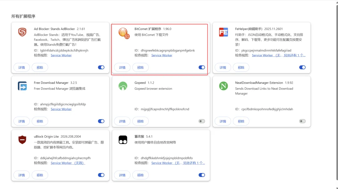 若勾选了浏览器集成,则会自动向指定浏览器添加对应插件,下面是本人Chrome浏览器中自动添加的插件: